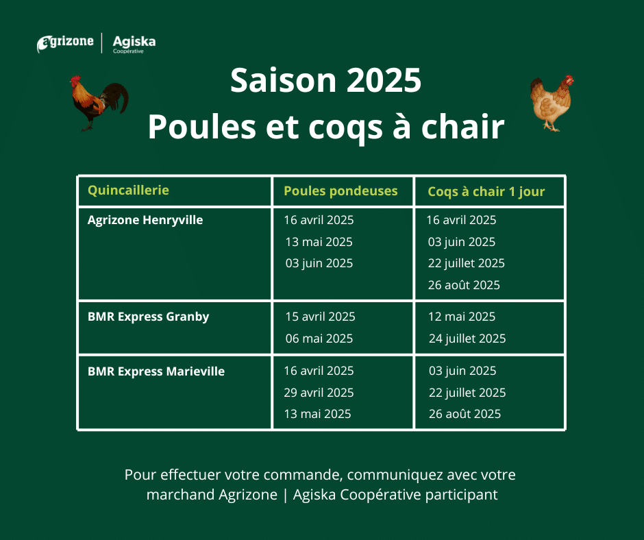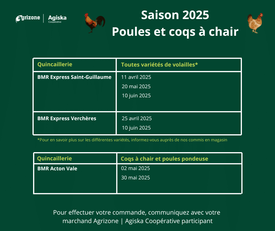 Encore une fois cette année, vous pouvez dès maintenant réserver vos poules, vos poussins et toutes autres volailles dans votre Agrizone Henryville, BMR Acton Vale, BMR Express Granby, BMR Express Marieville, BMR Express Saint-Guillaume et BMR Express Verchères.